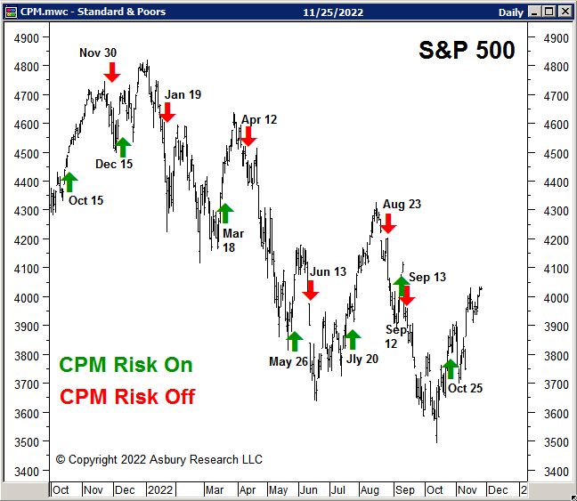 Here is the corresponding chart that highlights CPM’s Risk On and Risk Off Signals since October 2021. It shows that CPM is currently on a Risk On status as of October 25th. The S&P 500 has risen by 5.4% since then.