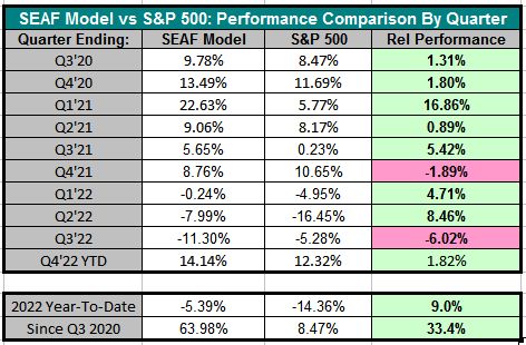 The table below shows that the SEAF Model has outperformed the S&P 500 in 8 of the past 10 quarters.