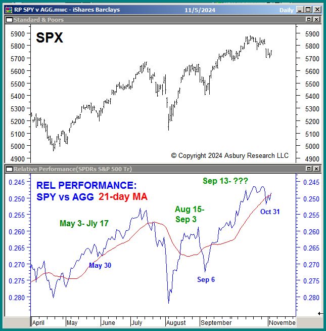 As long as the current relative outperformance trend by SPY remains intact, underlying support at SPX 5706 to 5652 is likely to hold and the current broad market advance is likely to continue. A sustained decline by SPY versus AGG, however, would warn of an emerging US broad market correction.