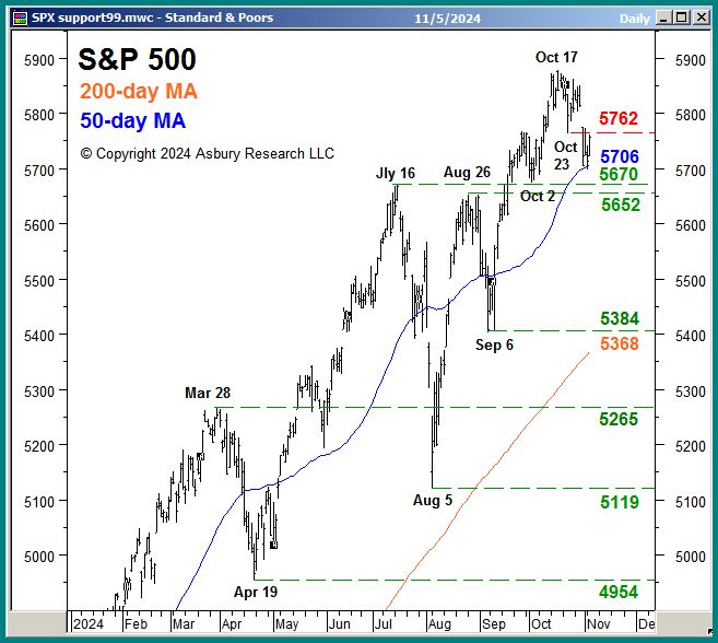Chart 1 below plots the S&P 500 (SPX) daily since January and identifies the key index levels as of mid-morning today. For the past four sessions, SPX has been situated right on top of Primary Tactical Support at 5706 to 5652, which represents the convergence of the 50-day moving average (minor trend proxy) and the Jly 16th and Aug 26th benchmark highs.