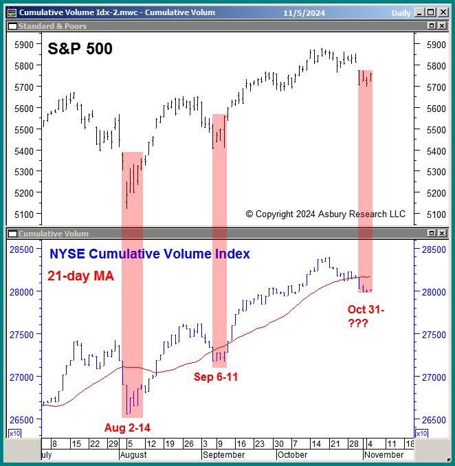 The rightmost red highlights in the lower panel of Chart 2 below show that the NYSE Cumulative Volume Index (CVI) edged below its 21-day moving average on Oct 31st to indicate an emerging monthly trend of contracting volume. Contracting volume indicates a lack of urgency to buy and is characteristic of Tactical market declines. The other red highlights show that, although brief, the previous two instances of monthly volume contraction coincided with the previous two declines in the S&P 500 (upper panel).