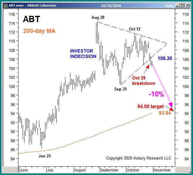 Abbott Laboratories’ (ABT) breakdown from 2 months of sideways investor indecision suggests that a Strategic top is in place at the Aug 28th high and targets a 10% decline to $94.00 per share that will remain valid below $107.41. Due to ABT’s statistically significant and stable positive correlation to the S&P 500 throughout the past 40 years, an upcoming decline in ABT is seen as also being indirectly negative for the US broad market.