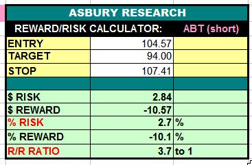 Chart 1 below plots ABT daily since June, highlighting an emerging breakdown from 2 months of sideways investor indecision. This breakdown suggests that a Strategic top is in place at the Aug 28th high and targets a 10% decline to $94.00 per share that will remain valid below the lower boundary of the indecision area, currently at $106.30.