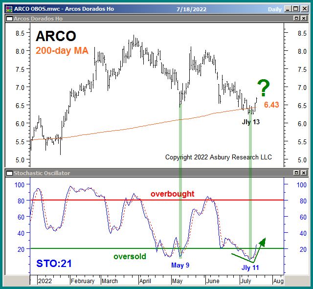 The upper panel of Chart 1 below plots ARCO daily since January along with its 200-day moving average, a widely-watched major trend proxy currently at $6.43. ARCO is currently testing and rising from this level as major underlying support. The lower panel plots monthly overbought/oversold conditions according to the 21-day (monthly) Stochastic oscillator. The green highlights show that ARCO is currently rising out of monthly oversold extremes and that the previous instance of this coincided with a Tactical bottom on May 9th.