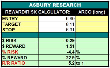 Consumer Discretionary stock Arcos Dorados Holdings (ARCO) is currently testing major underlying support near $6.43 amid monthly oversold conditions, setting up a potential low risk buying opportunity. A sustained rise above the $6.43 area would target a 23% rise to $8.11. This is an Asbury Value idea.
