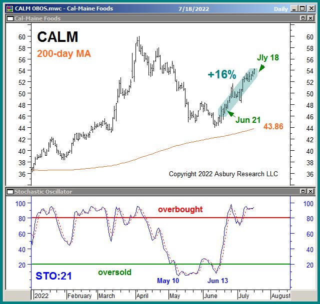 Chart 2 below is an updated version of the one displayed in our Jun 21st Asbury Alert entitled Cal-Maine Foods (CALM): Low-Risk Buying Opportunity?, It shows that we have closed out our Jun 21st long idea in CALM this morning for a 16% gain. Not shown is that CALM also outperformed the benchmark S&P 500 by 10% during this same period.