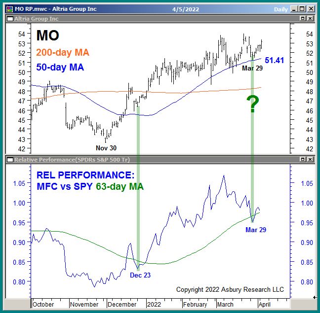 The green highlights show that MO is currently rebounding from a Mar 29th test of support at its 50-day MA (upper panel) while the relative performance line between MO and SPY is rebounding from a coincident test of its 63-day MA (lower panel), which defines its 2022 trend of Strategic relative outperformance versus the broad market. Combined, these metrics indicate a low risk/potentially high reward opportunity to buy MO.