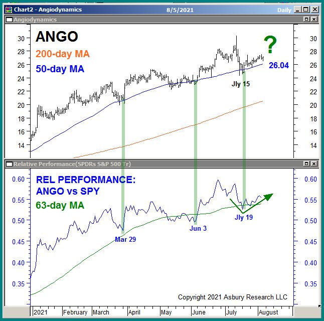 The rightmost green highlights in the upper panel of Chart 1 below show that ANGO is currently rebounding from a Jly 15th test of its 50-day moving average, a widely-watched minor trend proxy current situated at $26.04. Meanwhile, the blue daily relative performance line between ANGO and the SPDR S&P 500 ETF (SPY) in the lower panel is rebounding from a coincident test of its 63-day moving average, which is our Strategic time period. Together they suggest a new Tactical buying opportunity within ANGO’s November 2020 major uptrend as defined by its 200-day MA.