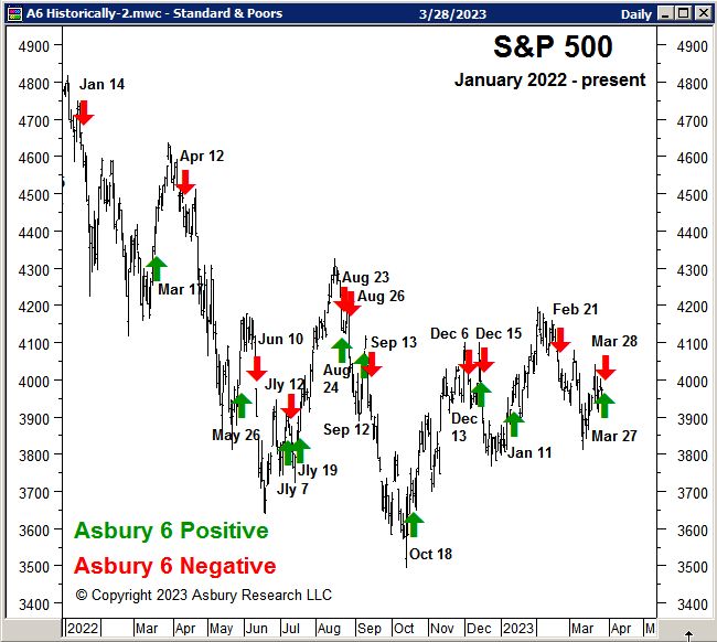 Editor’s Note: When the market is at a Tactical inflection point, we will often see the Asbury 6 constituents move quickly and erratically back and forth between Positive (green), Negative (red), and sometimes equally balanced (3 positive/3 negative) readings. We call this phenomenon “blinking”. The Asbury 6 is blinking now. Blinking indicates temporary investor indecision, and the market level where the blinking occurs typically becomes the starting point of the market’s next sustained directional move.