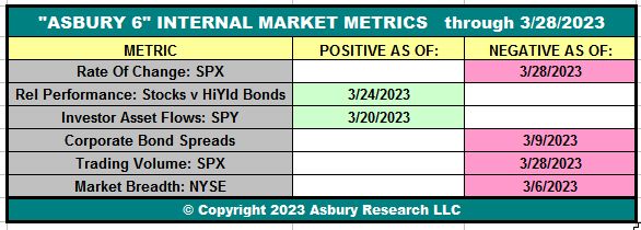Table 1 below shows that, as of the close on Tuesday March 28th, four of the Asbury 6 constituent metrics have shifted back to negative (red). This turns the “A6” Model back to a Negative status, from Positive on March 27th, as four or more metrics in one direction indicate a directional bias.