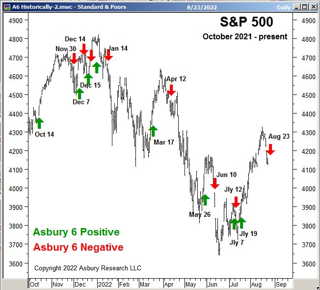 A: The Asbury 6 is a combination of six diverse market metrics that we have combined as a tool to look beyond the day-to-day, up-and-down noise of the stock market to determine its actual health — in much the same way as a doctor first checks the patient’s vital signs during an office visit. We view the A6 as a lie detector test for the market. It helps us to identify real, sustainable market advances or declines from computer-driven traps for investors — the latter which we believe are often generated by algorithmic (computer) trading which now comprises about 80% of daily trading volume.