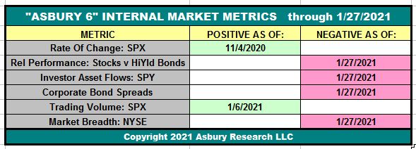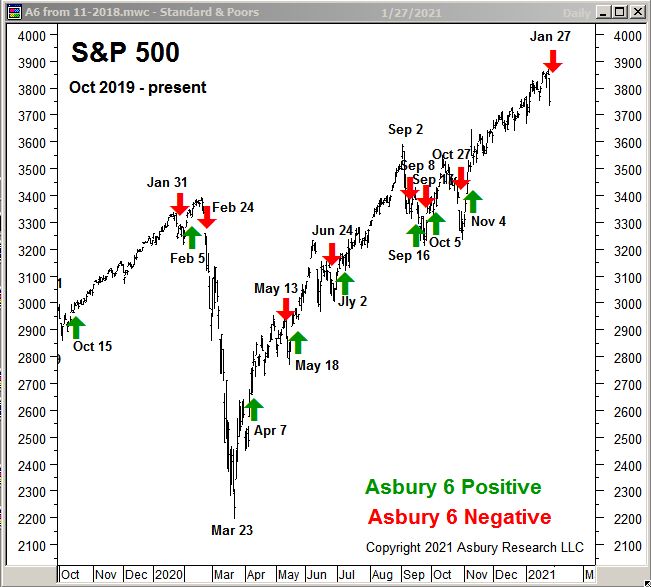 A: The Asbury 6 is a combination of six diverse market metrics that we have combined as a tool to to look beyond the day-to-day, up-and-down noise of the stock market to determine its actual health — in much the same way as a doctor first checks the patient’s vital signs during an office visit. We view the A6 as sort of “lie detector test” for the market. It helps us to identify real, sustainable market advances or declines from computer-driven traps for investors — the latter which we believe are often generated by algorithmic trading.