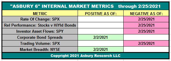Table 1 below shows that, as of the close on February 25th, four of the Asbury 6 constituent metrics have moved to negative (red), from positive (green) on February 2nd. This turns the “A6” Model itself to Negative as four or more metrics in one direction, either positive or negative, indicate a tactical bias.