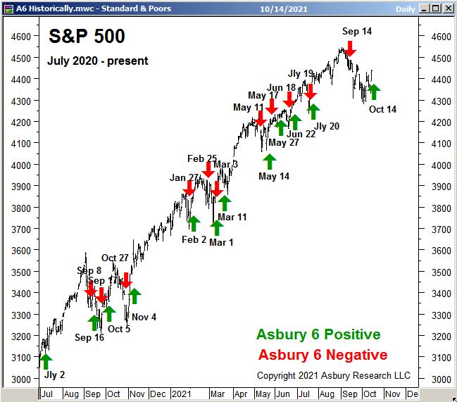 A: The Asbury 6 is a combination of six diverse market metrics that we have combined as a tool to look beyond the day-to-day, up-and-down noise of the stock market to determine its actual health — in much the same way as a doctor first checks the patient’s vital signs during an office visit. We view the A6 as a sort of “lie detector test” for the market. It helps us to identify real, sustainable market advances or declines from computer-driven traps for investors — the latter of which we believe are often generated by algorithmic trading.