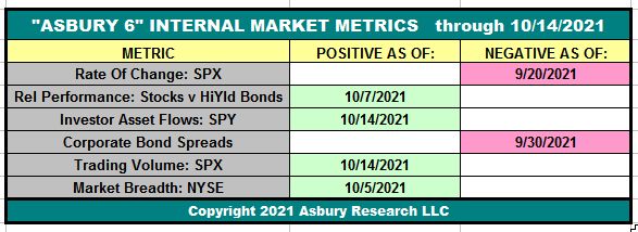 Table 1 below shows that, as of the close on October 14th, four of the Asbury 6 constituent metrics have moved to a positive (green) reading. This turns the “A6” Model itself to Positive as four or more metrics in one direction, either positive or negative, indicate a tactical bias.