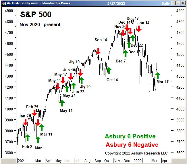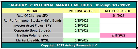 Table 1 below shows that, as of the close on March 17th, four of the Asbury 6 constituent metrics have moved to a positive (green) reading. This turns the “A6” Model to a Positive status, from Negative on January 14th, as four or more metrics in one direction indicate a directional bias.
