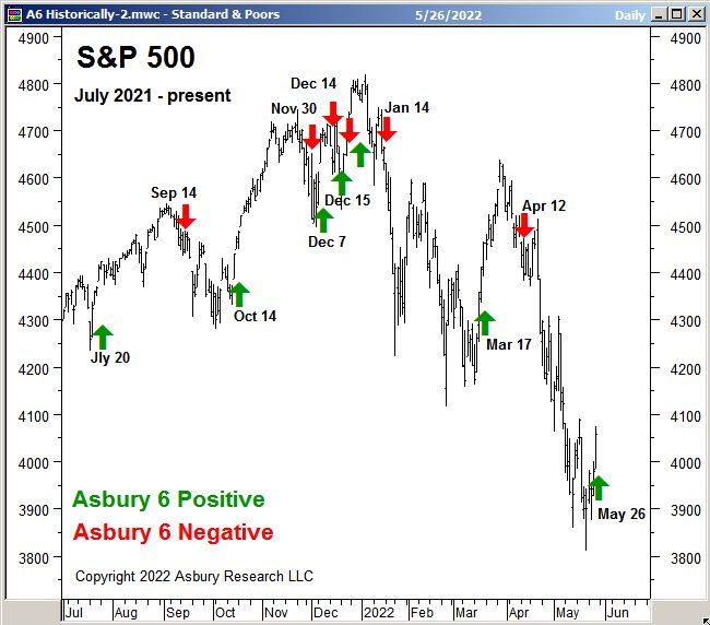 A: The Asbury 6 is a combination of six diverse market metrics that we have combined as a tool to look beyond the day-to-day, up-and-down noise of the stock market to determine its actual health — in much the same way as a doctor first checks the patient’s vital signs during an office visit. We view the A6 as a lie detector test for the market. It helps us to identify real, sustainable market advances or declines from computer-driven traps for investors — the latter which we believe are often generated by algorithmic (computer) trading which now comprises about 80% of daily trading volume.