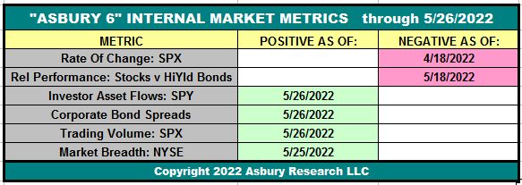 Table 1 below shows that, as of the close on May 26th, four of the Asbury 6 constituent metrics have moved to a positive (green) reading. This turns the “A6” Model to a Positive status, from Negative on April 12th, as four or more metrics in one direction indicate a directional bias.
