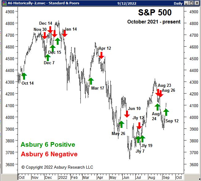 A: The Asbury 6 is a combination of six diverse market metrics that we have combined as a tool to look beyond the day-to-day, up-and-down noise of the stock market to determine its actual health — in much the same way as a doctor first checks the patient’s vital signs during an office visit. We view the A6 as a lie detector test for the market. It helps us to identify real, sustainable market advances or declines from computer-driven traps for investors — the latter which we believe are often generated by algorithmic (computer) trading which now comprises about 80% of daily trading volume.