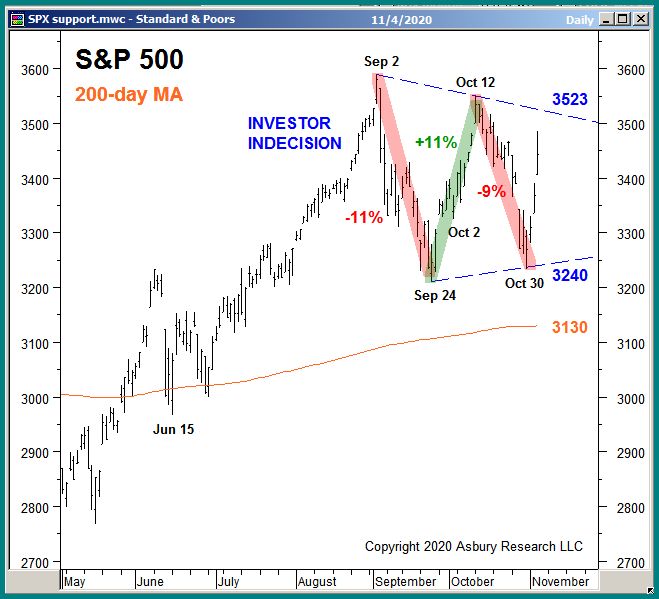 A: Signal volatility in our Tactical models indicates Investor Indecision. Chart 1 below plots the S&P 500 (SPX) daily since May. The chart shows that the US broad market index collapsed by 11% between Sep 2nd and 24th, then spiked higher by 11% between Sep 24th and Oct 12th, then collapsed lower by 9% from Oct 12th to 30th, and has most recently spiked 8% higher from Oct 30th through Nov 4th. This is extremely atypical price activity that was triggered by SPX holding above formidable support at 3233 to 3209, which we pointed out and discussed in our Oct 29th Special Report: Know Your Levels In SPX, but below overhead resistance at the 3588 Sep 2nd all-time high — right in the middle of a hotly contested presidential election. Our Tactical models are responding daily to price movement and market internals, and are not a crystal ball that can see what is going to happen next week.