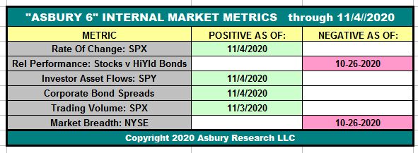 Table 1 below shows that, as of the close on November 4th, four of the Asbury 6 constituent metrics have moved to positive (green), from negative (red) on October 27th. This turns the A6 Model itself back to Positive as four or more metrics in one direction, either positive or negative, indicate a tactical bias.