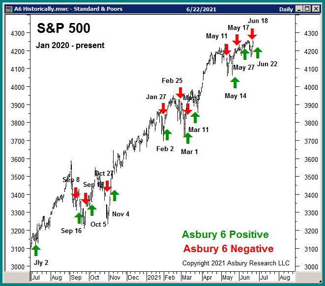 A: The Asbury 6 is a combination of six diverse market metrics that we have combined as a tool to look beyond the day-to-day, up-and-down noise of the stock market to determine its actual health — in much the same way as a doctor first checks the patient’s vital signs during an office visit. We view the A6 as a sort of “lie detector test” for the market. It helps us to identify real, sustainable market advances or declines from computer-driven traps for investors — the latter which we believe are often generated by algorithmic trading.