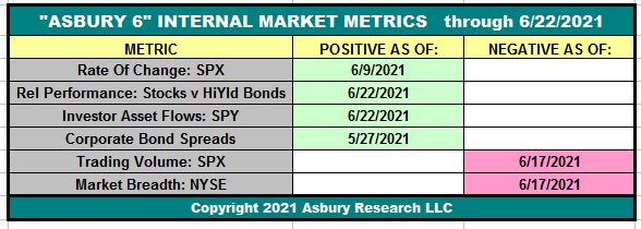 Table 1 below shows that, as of the close on June 22nd, four of the Asbury 6 constituent metrics have shifted back to positive (green), from three of six metrics being negative on June 21st. This minor change turns the “A6” Model back to to Positive as four or more metrics in one direction, either positive or negative, indicate a tactical bias.