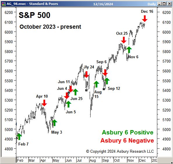 A: The Asbury 6 is a combination of six diverse market metrics that we have combined as a tool to look beyond the day-to-day, up-and-down noise of the stock market to determine its actual health — in much the same way as a doctor first checks the patient’s vital signs during an office visit. We view the A6 as a lie detector test for the market. It helps us to identify real, sustainable market advances or declines from computer-driven traps for investors — the latter which we believe are often generated by algorithmic (computer) trading which now comprises about 80% of daily trading volume.