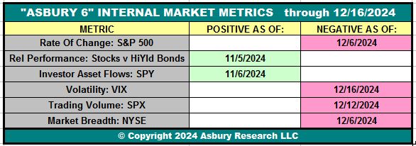 Table 1 below shows that as of the close on December 16th, four of the Asbury 6 constituent metrics have shifted to Negative. This changes the “A6” Model itself to a Negative status, from Positive on November 6th, as four or more metrics in one direction indicate a directional bias.