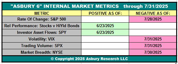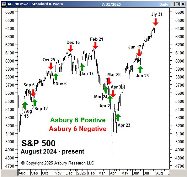 The graphic below shows that as of the close on July 31st, four of the Asbury 6 constituent metrics have shifted to Negative (red). This changes the “A6” Model itself to a Negative status, from Positive on June 23rd, as four or more metrics in one direction indicate a directional bias.