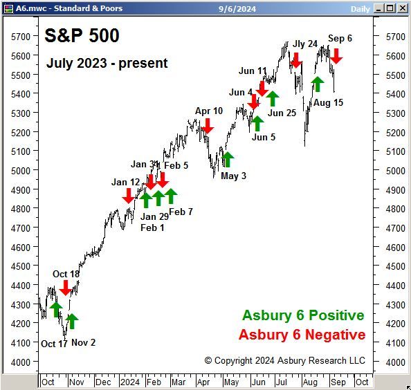 A: The Asbury 6 is a combination of six diverse market metrics that we have combined as a tool to look beyond the day-to-day, up-and-down noise of the stock market to determine its actual health — in much the same way as a doctor first checks the patient’s vital signs during an office visit. We view the A6 as a lie detector test for the market. It helps us to identify real, sustainable market advances or declines from computer-driven traps for investors — the latter which we believe are often generated by algorithmic (computer) trading which now comprises about 80% of daily trading volume.