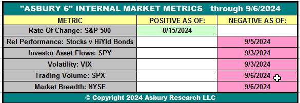 Table 1 below shows that as of the close on September 6th, 5 of the Asbury 6 constituent metrics have shifted to Negative (green). This changes the “A6” Model itself to a Negative status, from Positive on August 15th, as four or more metrics in one direction indicate a directional bias.