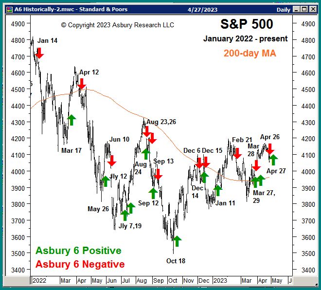 A: The Asbury 6 is a combination of six diverse market metrics that we have combined as a tool to look beyond the day-to-day, up-and-down noise of the stock market to determine its actual health — in much the same way as a doctor first checks the patient’s vital signs during an office visit. We view the A6 as a lie detector test for the market. It helps us to identify real, sustainable market advances or declines from computer-driven traps for investors — the latter which we believe are often generated by algorithmic (computer) trading which now comprises about 80% of daily trading volume.
