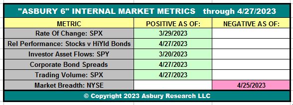 Table 1 below shows that, as of the close on April 27th, 5 of the Asbury 6 constituent metrics have shifted to positive (green). This turns the “A6” Model back to a Positive status, from Negative on April 26th, as four or more metrics in one direction indicate a directional bias.