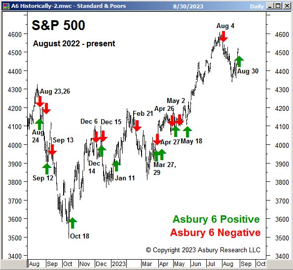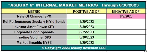 Table 1 below shows that, as of the close on August 30th, four of the Asbury 6 constituent metrics have shifted to positive (green). This changes the “A6” Model itself to a Positive status, from Negative on August 4th, as four or more metrics in one direction indicate a directional bias.
