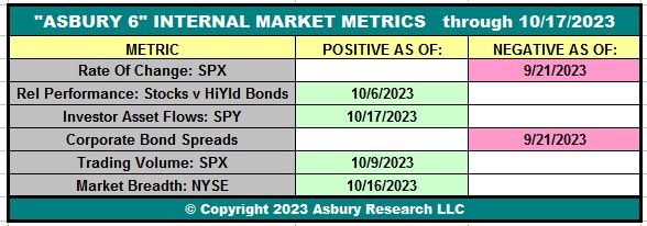 Table 1 below shows that as of the close on October 17th, 4 of the Asbury 6 constituent metrics have shifted back to positive (green). This changes the “A6” Model itself to a Positive status, from Negative on September 18th, as four or more metrics in one direction indicate a directional bias.