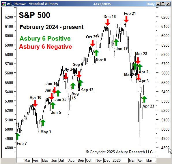 The Asbury 6 is a daily data-driven gauge of the US stock market’s real internal health according to six diverse metrics, which we selected via quantitative backtesting. It quantitatively answers the question, “Should I be increasing or decreasing my exposure to equities?” The Asbury 6 helps investors identify real, sustainable market advances or declines from the meaningless day-to-day market noise that often becomes computer-driven traps for investors.