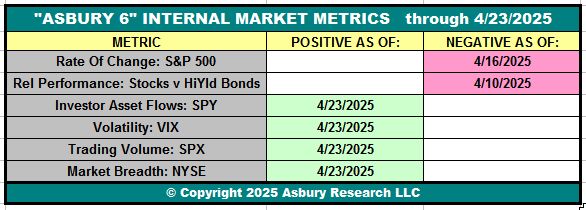 Table 1 below shows that as of the close on April 23rd, four of the Asbury 6 constituent metrics have shifted to Positive. This changes the “A6” Model itself back to a Positive status, from Negative on April 3rd, as four or more metrics in one direction indicate a directional bias.