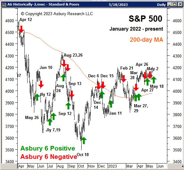 A: The Asbury 6 is a combination of six diverse market metrics that we have combined as a tool to look beyond the day-to-day, up-and-down noise of the stock market to determine its actual health — in much the same way as a doctor first checks the patient’s vital signs during an office visit. We view the A6 as a lie detector test for the market. It helps us to identify real, sustainable market advances or declines from computer-driven traps for investors — the latter which we believe are often generated by algorithmic (computer) trading which now comprises about 80% of daily trading volume.