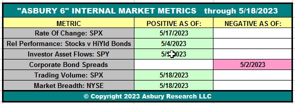 Table 1 below shows that, as of the close on May 18th, five of the Asbury 6 constituent metrics have shifted to positive (green). This turns the “A6” Model itself back to a Positive status, from Negative on May 2nd, as four or more metrics in one direction indicate a directional bias.