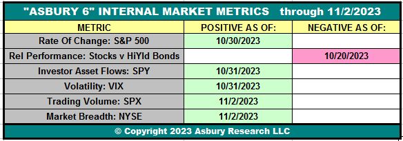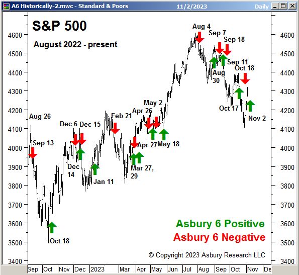 Editor’s Note: We have recently backtested each of the individual metrics that comprise the Asbury 6 to determine how well they perform as Tactical indications of US stock market direction — both individually and as a whole within the “A6”. We made several minor changes/adjustments which have resulted in a much better, more responsive model that has managed to stay right with the S&P 500 over the past five years during uptrends and downtrends alike — but with only about half the risk. You can learn more about this change by reading our 10-24-2023 report entitled Special Report: Updated Asbury 6™ Model & Performance.