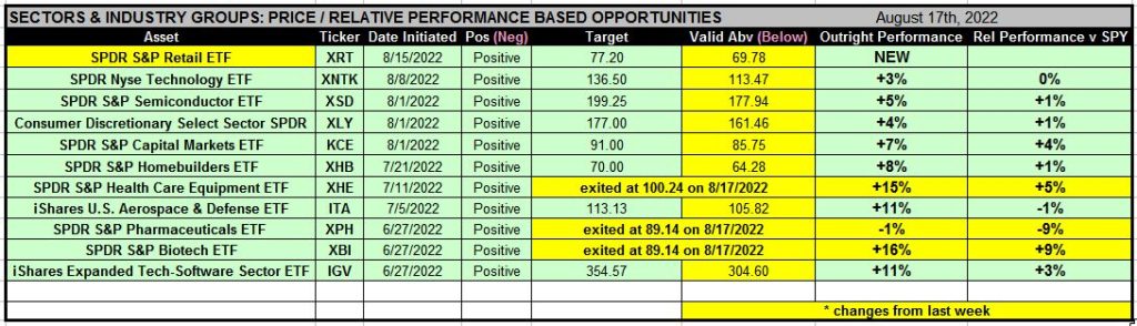 In the Monday August 15th Keys To This Week: Market Sectors & Industry Groups report, we aggressively tightened the protective stops on the long ideas listed in Table 2, entitled SECTORS & INDUSTRY GROUPS: PRICE / RELATIVE PERFORMANCE BASED OPPORTUNITIES, because many had quickly accumulated significant gains in outright and relative performance.