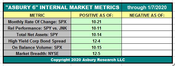 Those positive market internals, as measured by our Asbury 6 tactical model shown in Table 1 below, are all currently positive. Moreover, the table shows that 4 of 6 of them have actually been positive since mid October.