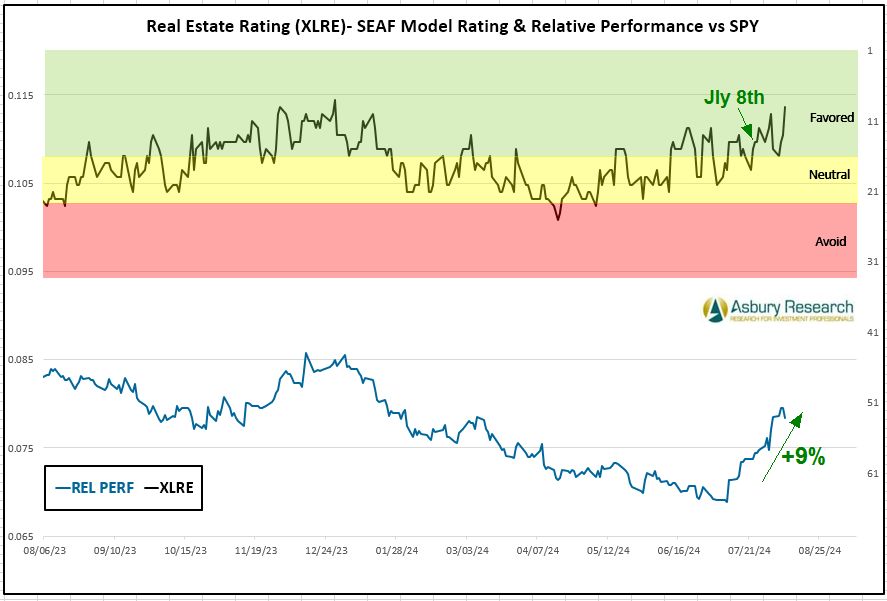 Cyclical Real Estate is the SEAF Model’s second-ranked sector this week with a Ranking score of 9 (from 10 a week ago). Chart 2 below shows that XLRE has outperformed the S&P 500 (SPY) by 5% since Jly 23rd, which is when Real Estate first moved to Favored status according to the SEAF Model. Real Estate has also been among the top four SEAF rankings for the past six weeks beginning Jly 8th. As long as XLRE remains among the top three-ranked sectors, it will remain on a buy/overweight signal according to SEAF.