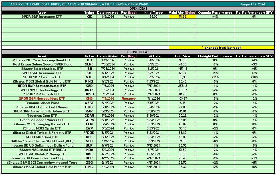 The ETF name and ticker, the date the idea was initiated, the price target, and the price that the idea remains valid above (or valid below if a short idea) are listed for each idea. The current performance of the idea, both outright and relative to the S&P 500, is also listed. The ideas are listed chronologically, with the newest ideas on top and new ideas or changes highlighted in yellow. These ideas are intended to identify short-term trading opportunities rather than longer-term investments.
