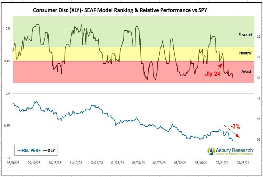 Cyclical Consumer Discretionary is the SEAF Model’s worst-ranked sector this week, with a Ranking score of 31. More importantly, Consumer Discretionary has also been one of the three worst-ranked sectors of the S&P 50 according to the SEAF Model for four of the past five weeks beginning Jly 15th. Chart 4 below shows that this sector has been on an Avoid status since Jly 24h (upper panel) while XLYE has coincidentally underperformed the S&P 500 (SPY) by 3%.