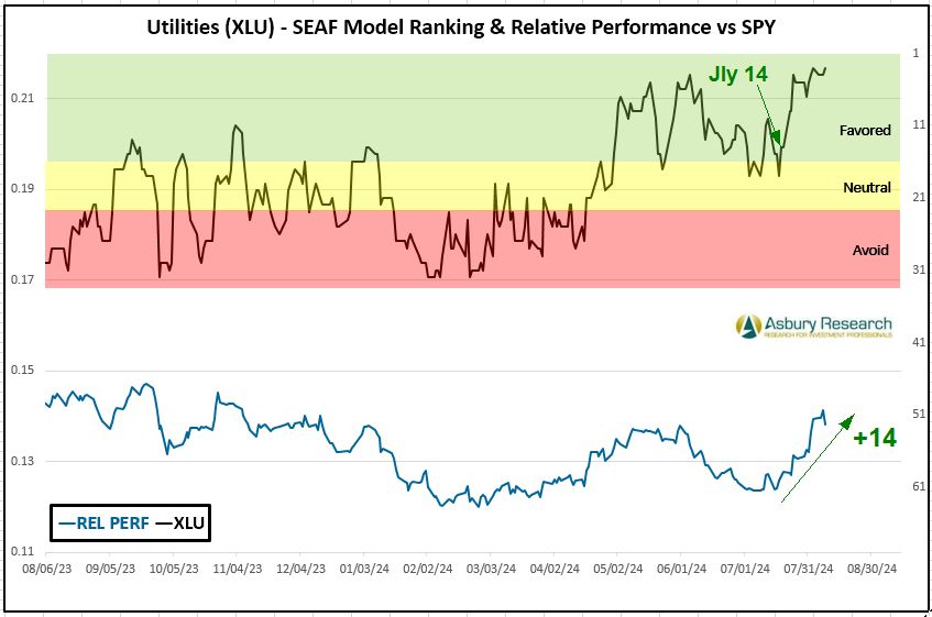 Defensive Utilities (XLU) is again the SEAF Model’s best-ranked sector with a Ranking score of 3 (from 4 a week ago). According to the SEAF Model, Utilities have been one of the three top-ranked sectors of the S&P 500 for the past five weeks beginning July 15th and have outperformed the benchmark S&P 500 (SPY) by 14% during that period, as shown in the lower pane of Chart 1 below. The longer Utilities retains its Favored ranking, the more likely XLU’s recent trend of relative outperformance versus SPY is likely to continue.