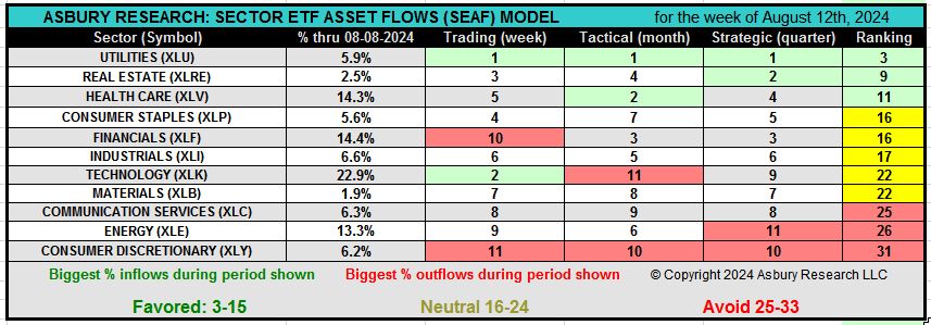 In the SEAF Model Graphic below, the Ranking column sorts the entire table of 11 sector ETFs according to the sum of rankings in the Trading (weekly), Tactical (monthly), and Strategic (quarterly) categories, from largest inflows to largest outflows. The premise of the model is to invest in the sectors that the money is going into and to avoid the sectors the money is coming out of.