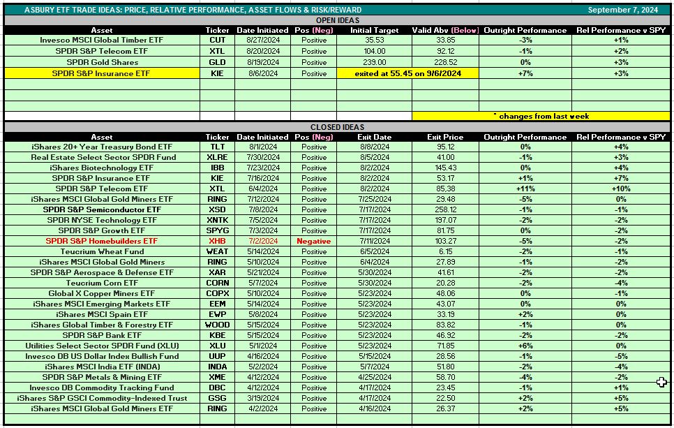 The ETF name and ticker, the date the idea was initiated, the price target, and the price that the idea remains valid above (or valid below if a short idea) are listed for each idea. The current performance of the idea, both outright and relative to the S&P 500, is also listed. The ideas are listed chronologically, with the newest ideas on top and new ideas or changes highlighted in yellow. These ideas are intended to identify short-term trading opportunities rather than longer-term investments.
