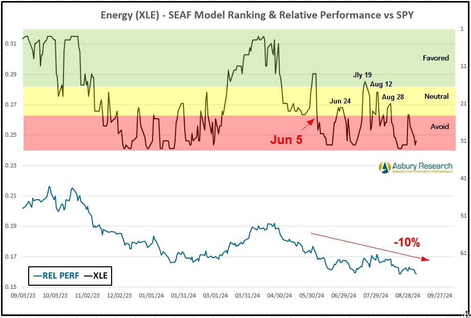 Economically sensitive Energy (XLE) is the SEAF Model’s worst-ranked sector this week with a Ranking score of 31. More importantly, Energy has also been one of the three worst-ranked sectors of the S&P 50 according to the SEAF Model for 12 of the past 14 weeks beginning Jun 5th. Chart 4 below shows that Energy has, for the most part, been on an Avoid or Neutral status since Jun 5th (upper panel) while XLE has coincidentally underperformed the S&P 500 (SPY) by 10%.